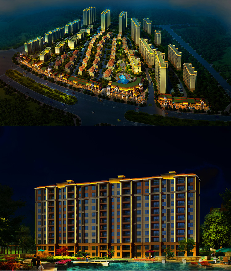 碧桂園小區建筑泛光照明,建筑輪廓照明和局部重點照明進行建筑環境景觀的在塑造,設計中舍棄了景觀中繁瑣細節的表現,將較直觀的景觀以大氣的燈光渲染出來,營造大氣的燈光氛圍,以節能而質樸的燈光為市民營造一個優美高雅的夜間環境,為韓城夜色添了一道亮麗風景。打造出綠色的主題思想。