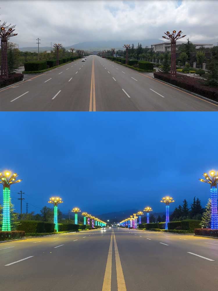 甘肅平涼9米景觀燈項目,安裝位于崆峒山下的市政道路倆側,主光源采用16個LED模組光源組成,配合燈體400的RGB點光源構成,系統采用512控制,夜晚整體趁現炫彩效果,亮化倆側道路。
