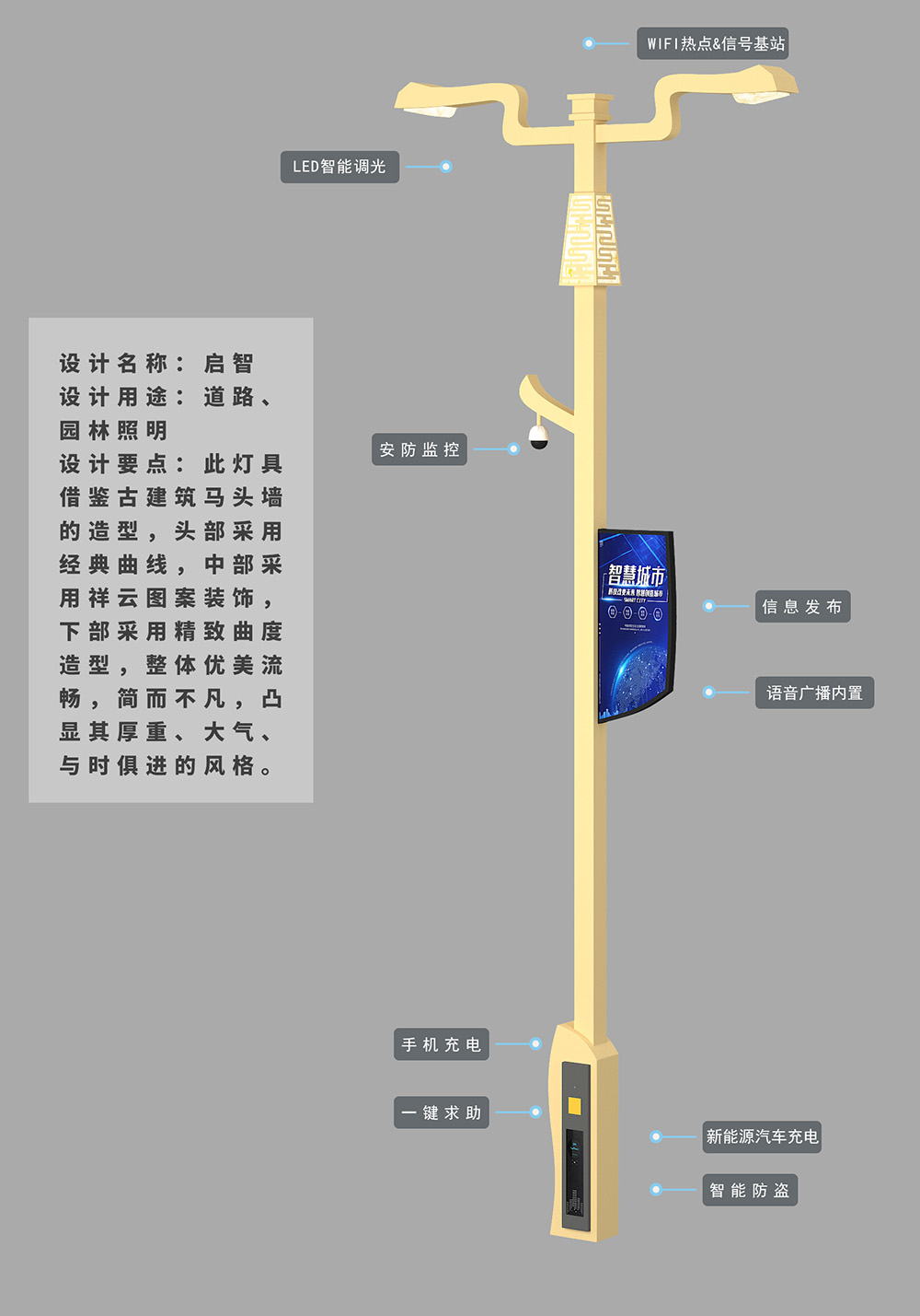 簡介—— 設計要點:此燈具借鑒古建筑馬頭墻的造型,頭部采用經典曲線,中部采用祥云圖案裝飾,下部采用精致曲度造型,整體優美流暢,簡而不凡。 專利種類:外觀設計 專利號:ZL 2022 3 0032793.0